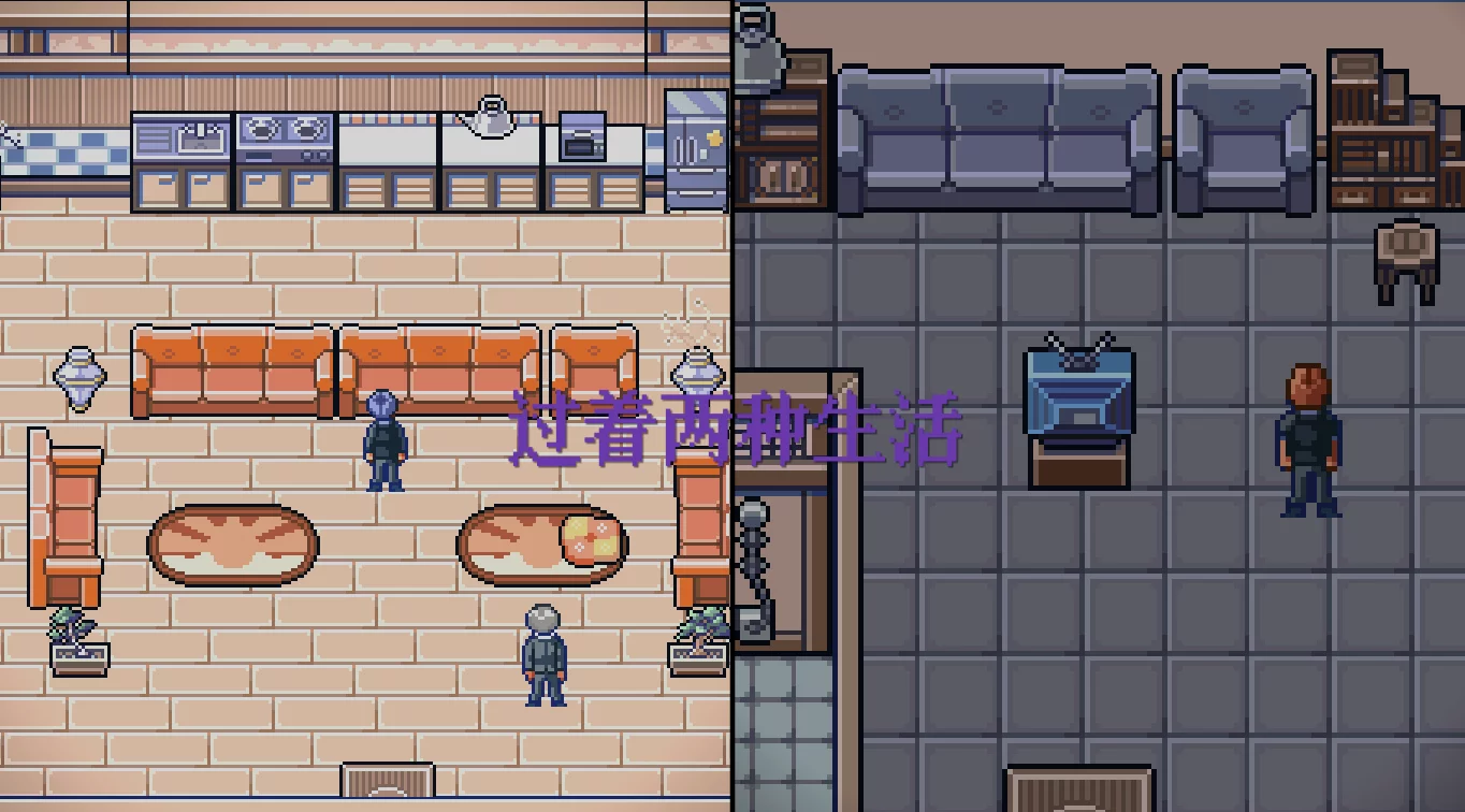 打开试玩版,伴随着节奏强劲的音乐,屏幕从中间一分为二,两个像素风角色展示着各自的生活。旁白告诉玩家:“我”的意识可以控制两个身体。这样的人生原本顺风顺水,快乐无比,但两人在高一被分到一个班后,“我”的命运出现了奇妙的变化。这样的设定初见有点奇怪,不过当我读完小说,再次进入游戏,我才意识到看上去简单的情节背后有着十多年的发展变化,这些角色逐渐变得和蔼可亲。