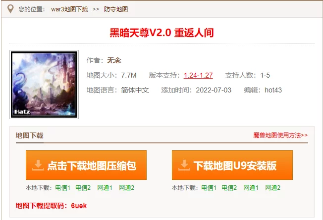 从那时起,无念把大部分业余时间泡在论坛里,发帖提问,仔细搜集每一个 3D 模型,每个学期都会产出一些实验品和半成品。2008 年 2 月,他把第一张原创地图《真魔猎人》发布在游久网,这是当时国内最大的魔兽自定义地图发布站。如今游久网的魔兽地图专区虽然还能正常浏览,但数据混乱和丢失的程度 非常严重。写这篇文章期间,我甚至在首页刷到了《黑暗天尊 v2.0》的信息,系统显示的添加时间为 7 月 3 日,而这个版本实际上是 2014 年发布的。
