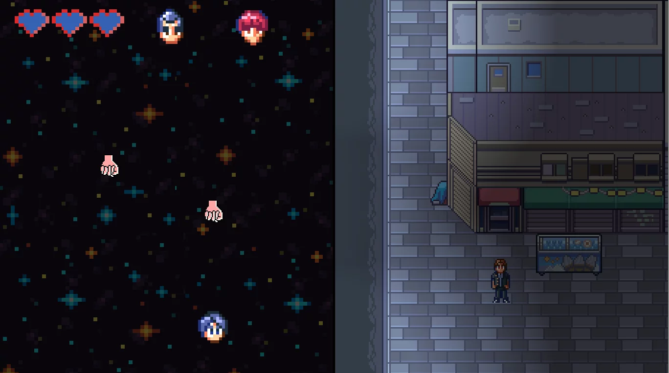 尽管创作团队把大部分时间花在了探讨剧情和设计人物上,但游戏中内置的小游戏能直观地反映出开发者在玩法设计方面的用心。 《我是两个人》的完整版内置 10 款小游戏,试玩版中,除了上文的弹幕射击游戏外,玩家还要分别操控两人通关一款横版冒险小游戏,因主角身份的不同,虽然同样是横版冒险游戏,在一些细节上却存在着显著差异。