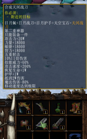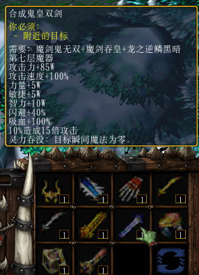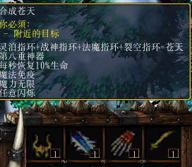 《黑暗天尊v1.0》里面有大量的新装备。除了在商店买的装备可以升级合成以外,还可以到野外掉落装备或者材料,合成各种神器、魔器。