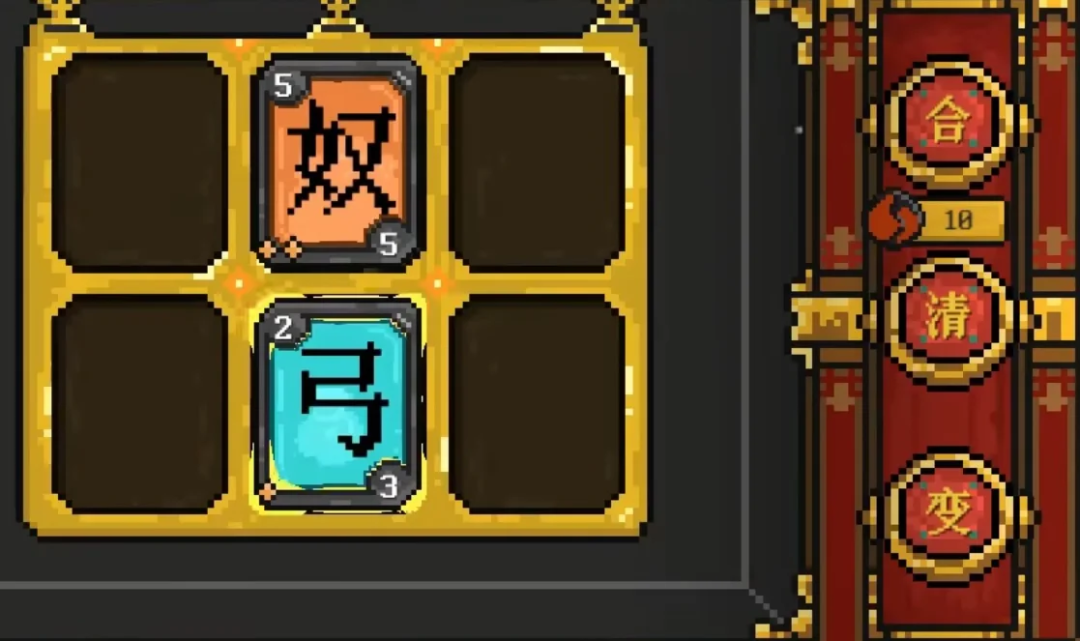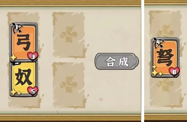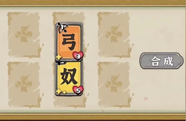 不同文字也代表了这张牌的性质。比如「弓」字代表的就是「弓箭」,具有远程攻击特性;「奴」字代表「奴隶」,只是一般的低级作战单位。二者合一成了「弩」,血量、攻击均有提升,卡牌也成了「弩箭」,战力理所当然更强大。