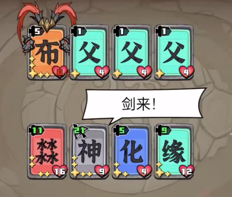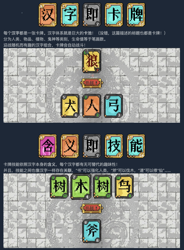 这是一款用汉字做卡牌的PVE对战游戏。每局游戏中,玩家可以抽到不同的文字,每个文字具有自己的攻击力(显示在左上角)、血量(显示在右下角),以及一些特殊技能(类似炉石传说的战吼、光环机制)。